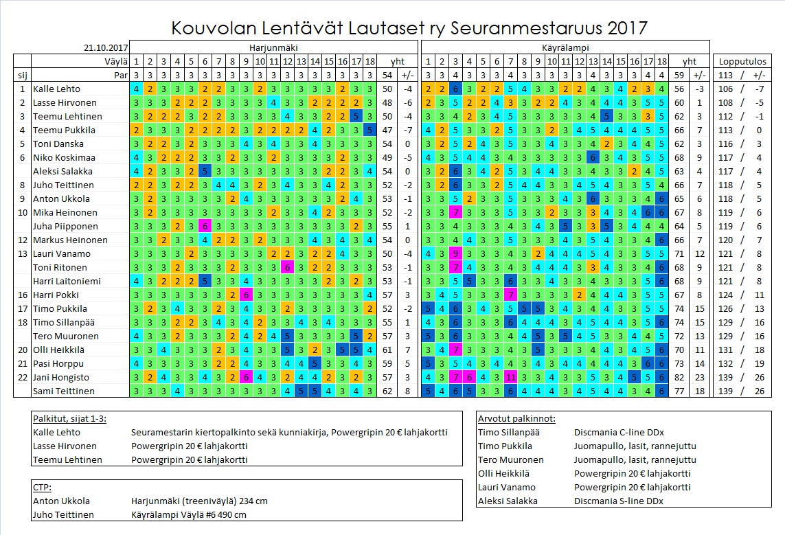 Kouvolan lentävien lautasten neljännet seuranmestaruuskilpailut pelattiin 21.10.2017